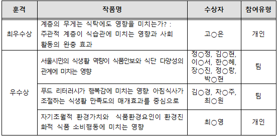 「서울시민먹거리조사 우수 논문(논문초록) 공모전」 최종 수상작을 다음과 같이 공고합니다.